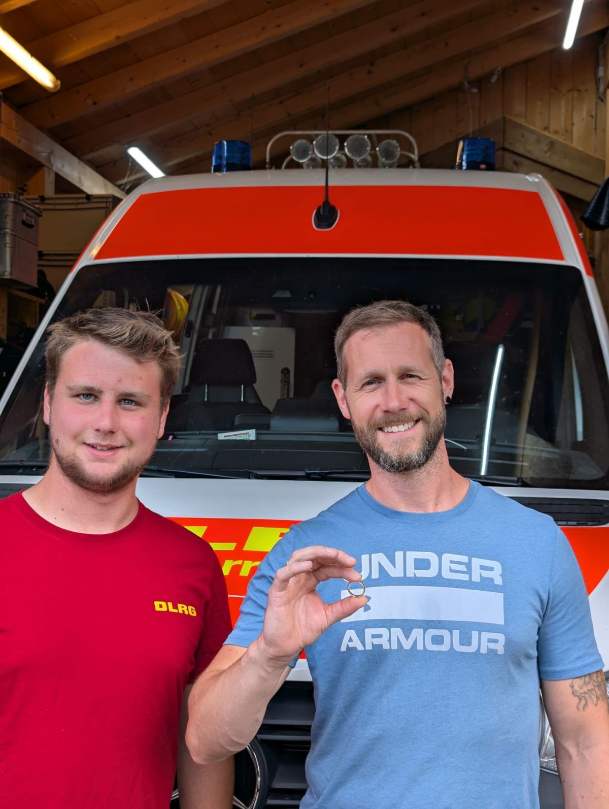 Am darauffolgenden Tag kommen Ben und Carina gemeinsam mit ihren beiden Kindern (zwei und vier Jahre) zur DLRG-Station in Truchtlaching. Sie nehmen den Ehering strahlend entgegen und Carina sieht sich in Ihrem Willen und der gemeinsamen Zukunft des Ehepaars sichtlich bestätigt: „Ich habe einfach gespürt, dass wir ihn wieder finden!“, sagt sie. Ben ergänzt: „Ich konnte es kaum glauben, als mir Martin am Telefon erzählte, dass er den Ring wirklich gefunden hatte! Ich bin der DLRG unendlich dankbar- für die schnelle und unkomplizierte Hilfe, aber vor allem auch für die Bereitschaft überhaupt nach ihm zu suchen!“ Als Zeichen Ihrer Dankbarkeit brachte die Familie Getränke und eine Spende für eine Brotzeit mit- zur großen Freude der Wasserretter.