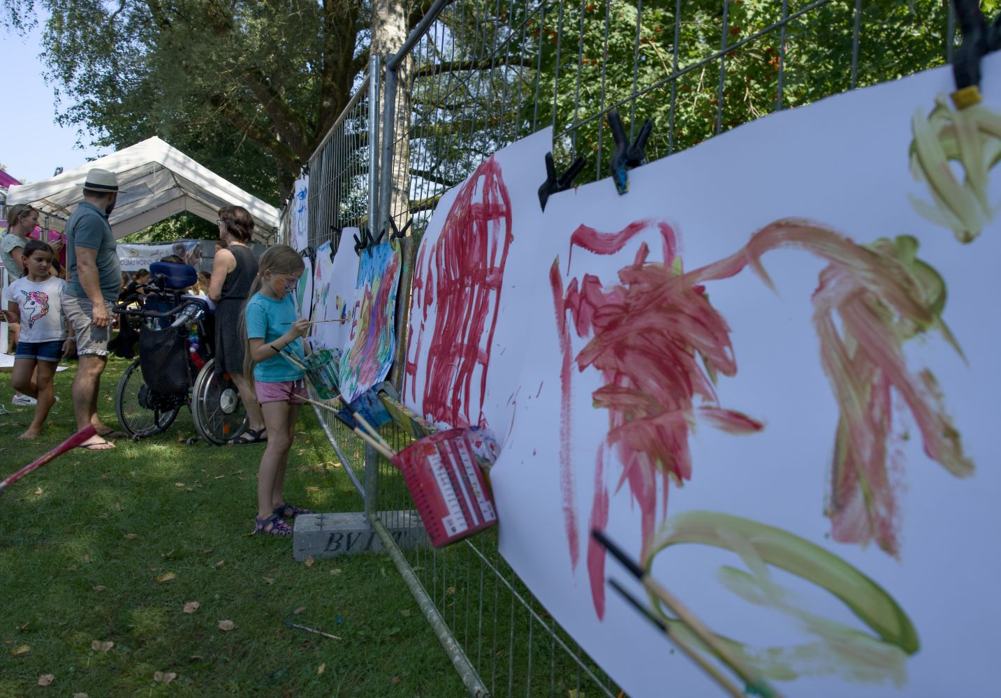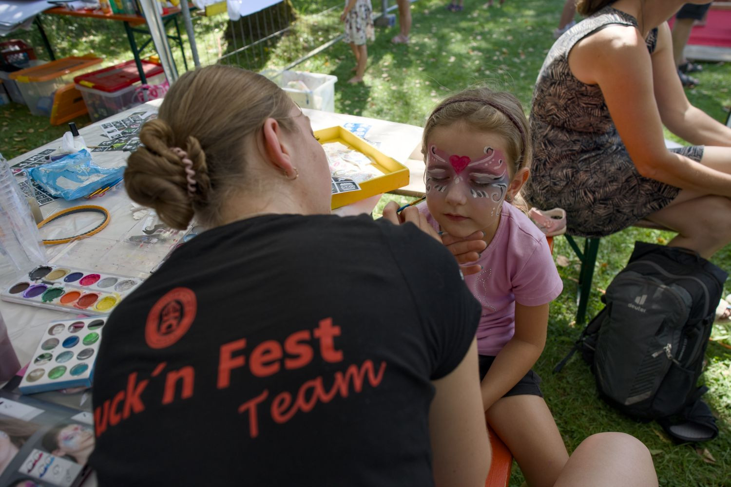 Schon am frühen Nachmittag strömten die ersten Besucher auf das Gelände, das bereits seit einigen Tagen von den Ehrenamtlichen der DLRG mit vielen Unterstützern von einem Strandbad in einen perfekten Ort für das Bruck'n-Fest verwandelt wurde. Familien machten es sich unter schattigen Bäumen gemütlich, während Kinder in die Spiel- und Kreativberieche eintauchten. Sie bemalten Leinwände, verwandelten sich dank fantasievoller Schminkaktionen in bunte Fabelwesen oder bauten aus großen Holzklötzen eigene Kunstwerke. Wer höher hinaus wollte, konnte mit Unterstützung des THWs Bierkisten-Stapeln oder sich in einer von zwei Hüpfbürgen austoben.